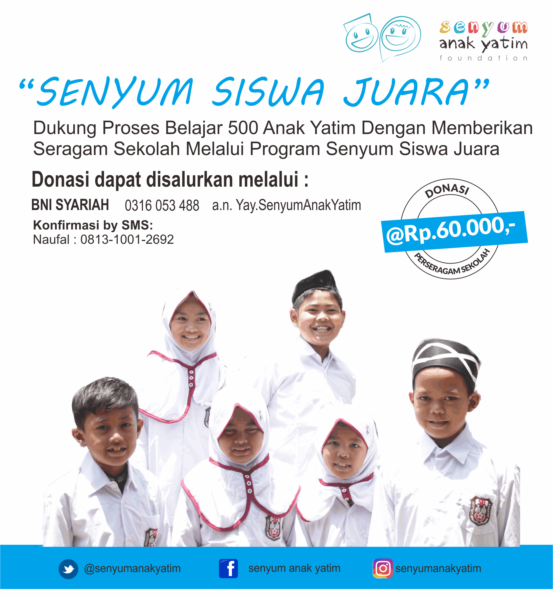 🧐 Program Senyum Siswa Juara merupakan sebuah program pendidikan dari Yayasan Senyum Anak Yatim, dimana setiap kita dapat berpartisipasi memberikan bantuan seragam sekolah kepada anak yatim,
