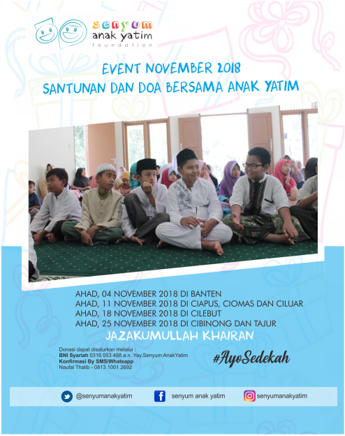 Barakallahu, setelah sukses terlaksana nya kegiatan bulanan kami pada bulan Oktober 2018 SenyumAnakYatim Foundation mengajak para kakak atau volunteers untuk ikut berpartisipasi dalam kegiatan kami selanjutnya dibulan