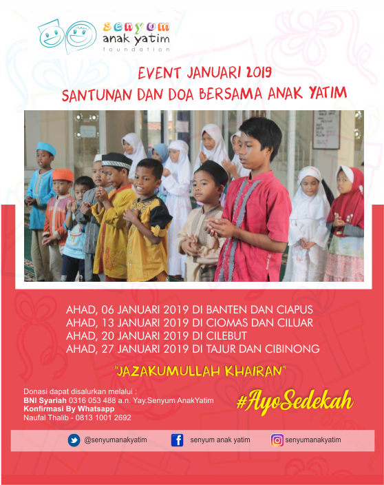 Barakallahu, setelah sukses terlaksana nya kegiatan bulanan kami pada bulan Desember 2018 SenyumAnakYatim Foundation mengajak para kakak atau volunteers untuk ikut berpartisipasi dalam kegiatan kami selanjutnya dibulan