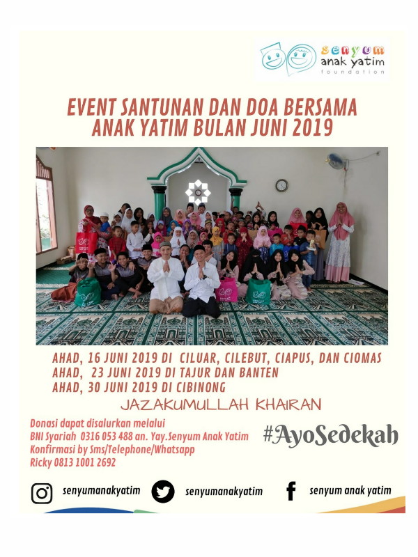 Barakallahu, setelah sukses terlaksana nya kegiatan bulanan kami pada bulan MEI 2019 SenyumAnakYatim Foundation mengajak para kakak atau volunteers untuk ikut berpartisipasi dalam kegiatan kami selanjutnya dibulan JUNI 2019 apa aja sih kegiatan/Program Bulanan SAY 🤔?