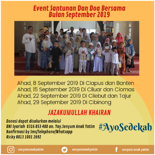 Barakallahu, setelah sukses terlaksana nya kegiatan bulanan kami pada bulan Agustus 2019 SenyumAnakYatim Foundation mengajak para kakak atau volunteers untuk ikut berpartisipasi dalam kegiatan kami selanjutnya dibulan