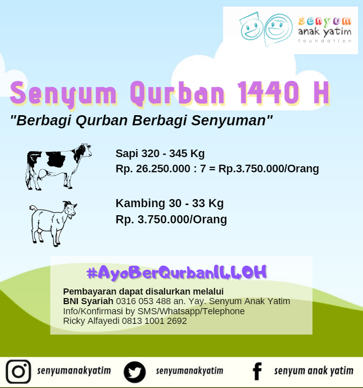 Idul Adha merupakan hari raya umat Islam di mana setiap muslim dianjurkan untuk berqurban. Seperti petikan surat al hajj di atas, Yayasan Senyum Anak Yatim turut merayakan Idul Adha dengan mengajak anda untuk berqurban...